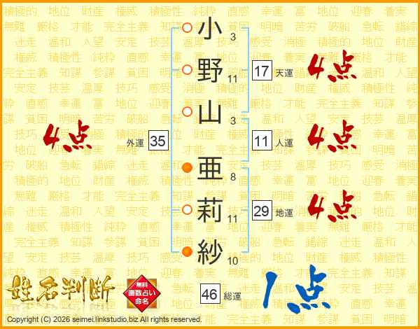 小(3画)野(11画)山(3画) 亜(8画)莉(11画)紗(10画)