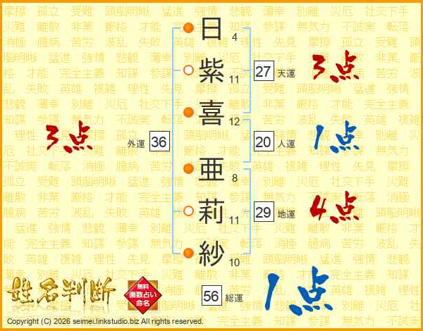 日(4画)紫(11画)喜(12画) 亜(8画)莉(11画)紗(10画)
