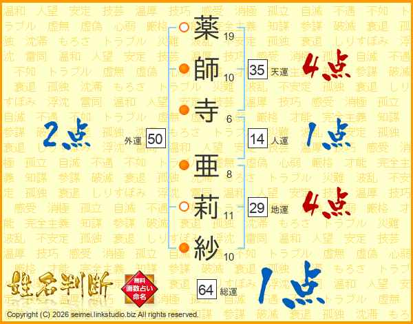 薬(19画)師(10画)寺(6画) 亜(8画)莉(11画)紗(10画)