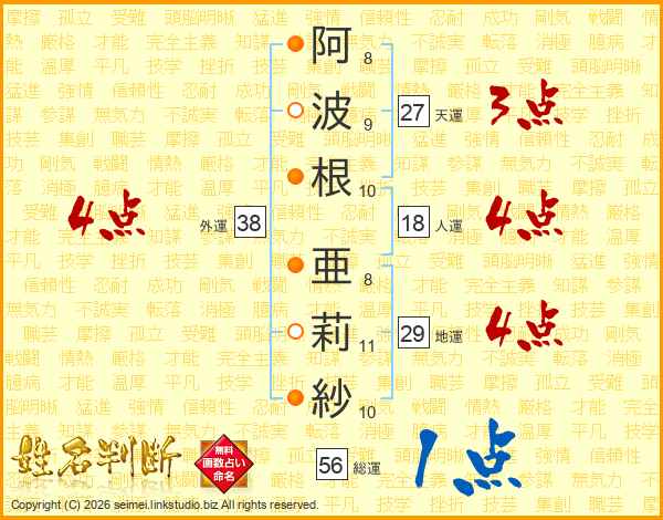 阿(8画)波(9画)根(10画) 亜(8画)莉(11画)紗(10画)