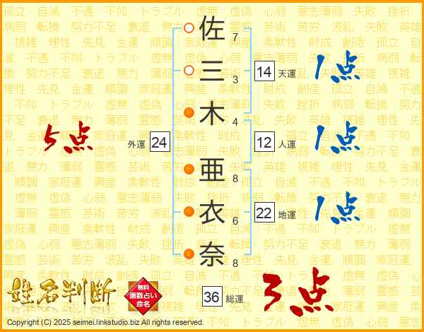 佐(7画)三(3画)木(4画) 亜(8画)衣(6画)奈(8画)