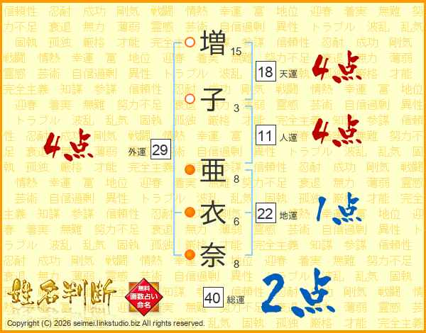 増(15画)子(3画) 亜(8画)衣(6画)奈(8画)