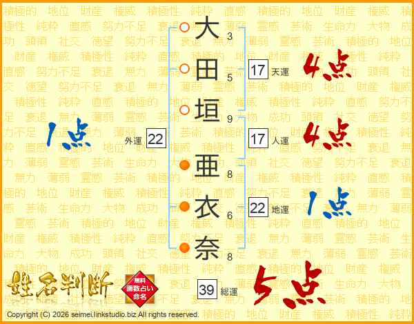 大田垣亜衣奈さんの総運は39画の5点!