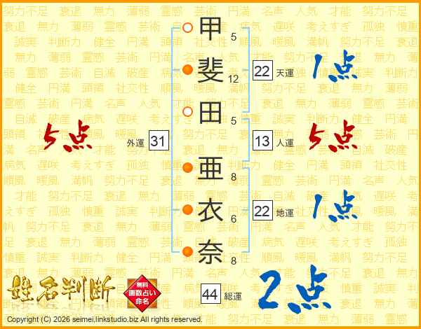 甲(5画)斐(12画)田(5画) 亜(8画)衣(6画)奈(8画)