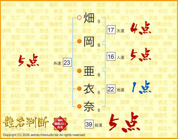 畑(9画)岡(8画) 亜(8画)衣(6画)奈(8画)