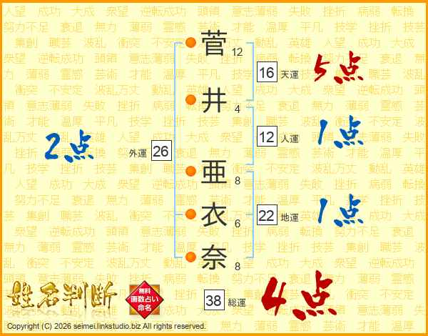 菅(12画)井(4画) 亜(8画)衣(6画)奈(8画)