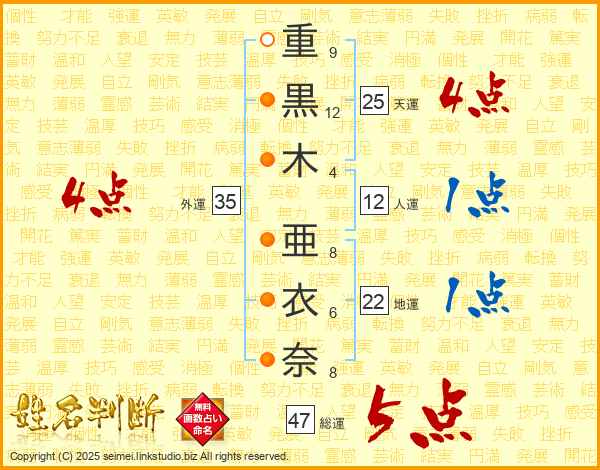 重(9画)黒(12画)木(4画) 亜(8画)衣(6画)奈(8画)