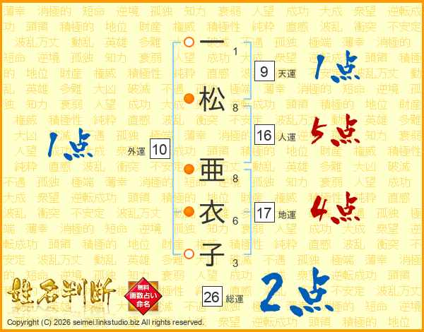一(1画)松(8画) 亜(8画)衣(6画)子(3画)