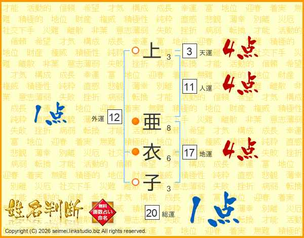 生活面を象徴する運勢です。外部から受ける影響力を表し、結婚運、家庭運や職場、環境への順応性を表します。総運から人運を引いた画数。姓や名が1文字の場合を除く。