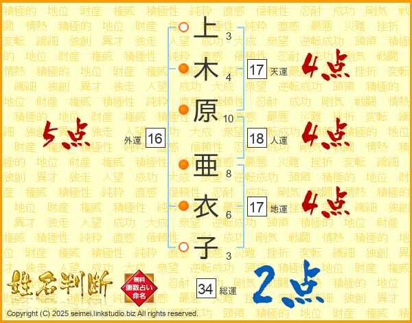 上(3画)木(4画)原(10画) 亜(8画)衣(6画)子(3画)
