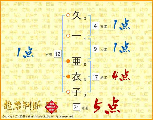 久一亜衣子さんの総運は21画の5点!