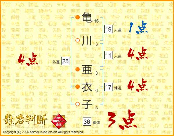 亀(16画)川(3画) 亜(8画)衣(6画)子(3画)