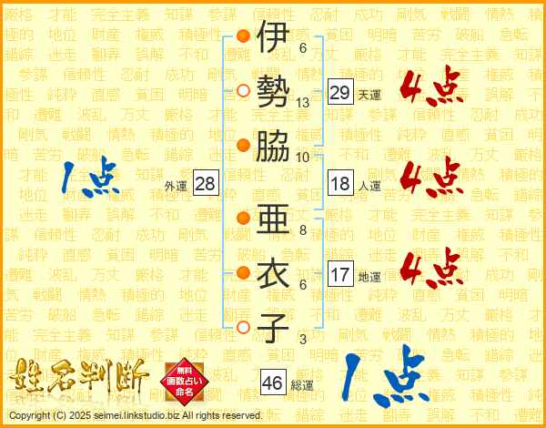 伊(6画)勢(13画)脇(10画) 亜(8画)衣(6画)子(3画)