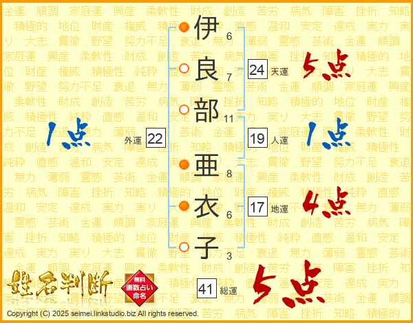 伊(6画)良(7画)部(11画) 亜(8画)衣(6画)子(3画)