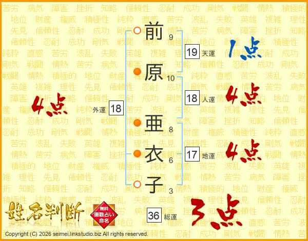 前(9画)原(10画) 亜(8画)衣(6画)子(3画)