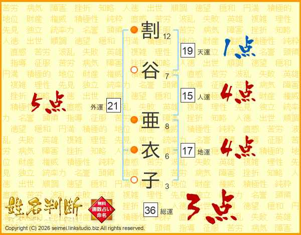 割谷亜衣子さんの総運は36画の3点!