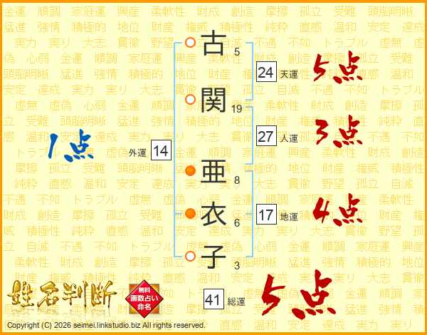 古(5画)関(19画) 亜(8画)衣(6画)子(3画)
