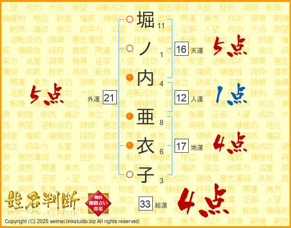 堀ノ内亜衣子さんの外運は21画の5点!