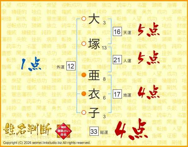 大(3画)塚(13画) 亜(8画)衣(6画)子(3画)