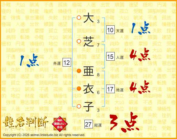 大(3画)芝(7画) 亜(8画)衣(6画)子(3画)