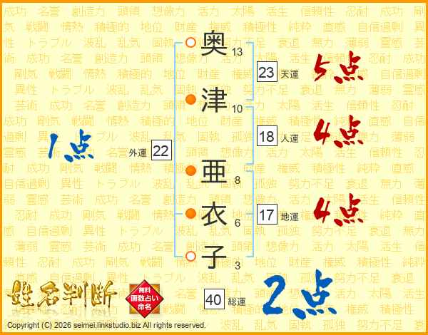 奥(13画)津(10画) 亜(8画)衣(6画)子(3画)