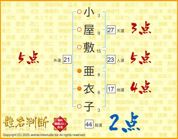 小(3画)屋(9画)敷(15画) 亜(8画)衣(6画)子(3画)