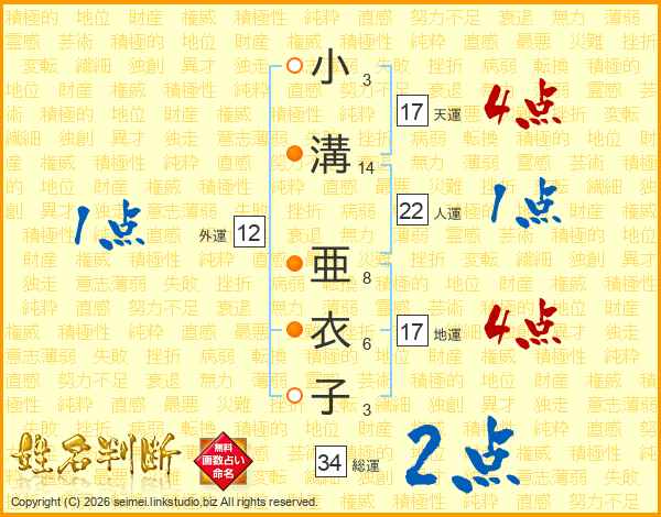 小溝亜衣子さんの総運は34画の2点!