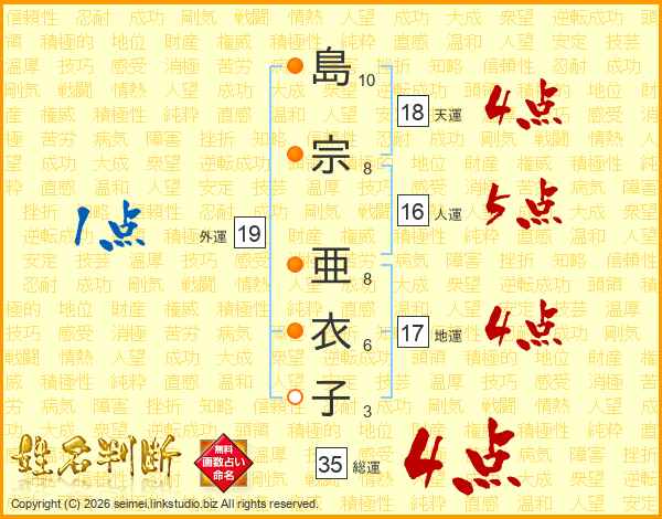 島(10画)宗(8画) 亜(8画)衣(6画)子(3画)