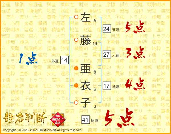 左(5画)藤(19画) 亜(8画)衣(6画)子(3画)