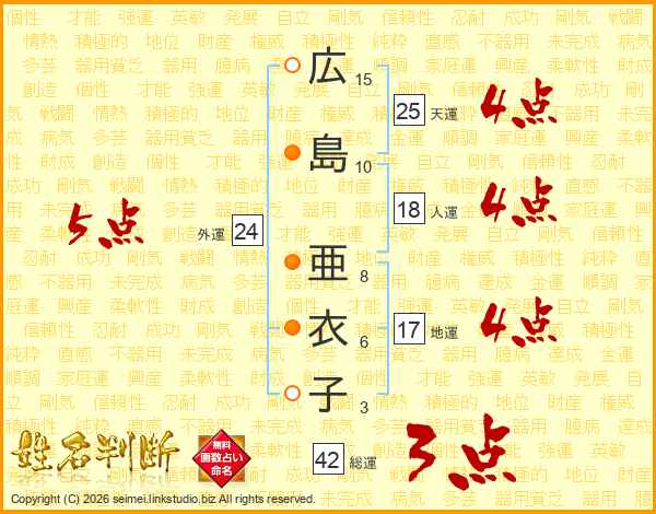 広(15画)島(10画) 亜(8画)衣(6画)子(3画)