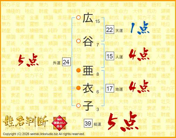広谷亜衣子さんの総運は39画の5点!