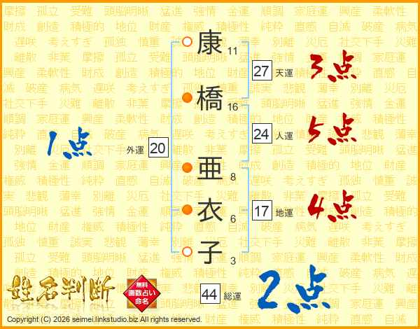 康橋亜衣子さんの総運は44画の2点!