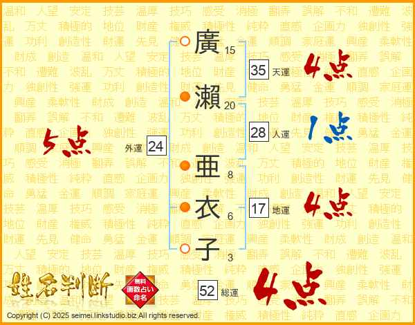 廣瀨亜衣子さんの総運は52画の4点!