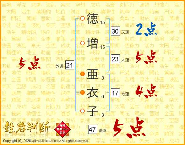 徳(15画)増(15画) 亜(8画)衣(6画)子(3画)