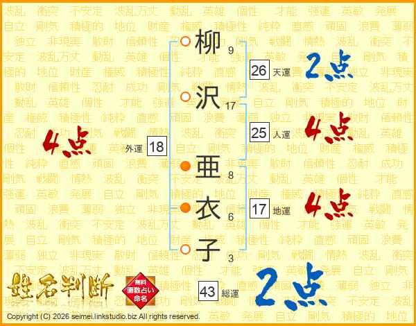 柳(9画)沢(17画) 亜(8画)衣(6画)子(3画)
