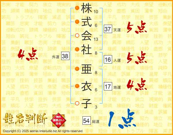 株(10画)式(6画)会(13画)社(8画) 亜(8画)衣(6画)子(3画)