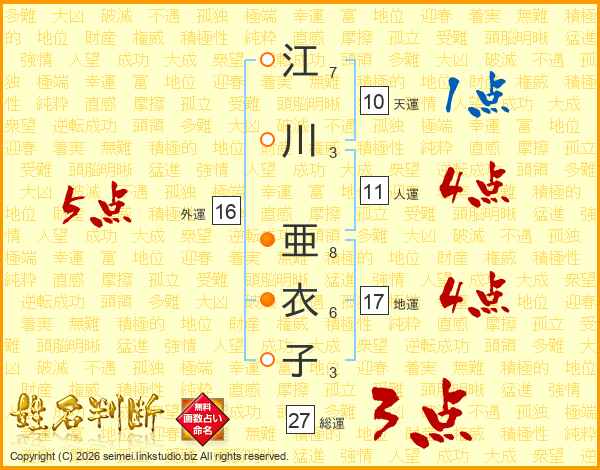 江(7画)川(3画) 亜(8画)衣(6画)子(3画)