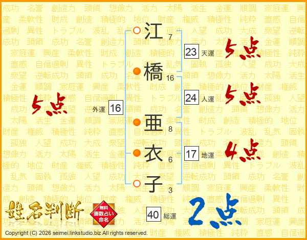 江(7画)橋(16画) 亜(8画)衣(6画)子(3画)