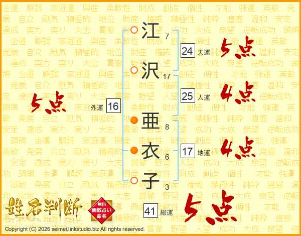江(7画)沢(17画) 亜(8画)衣(6画)子(3画)
