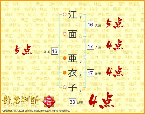 江面亜衣子さんの総運は33画の4点!