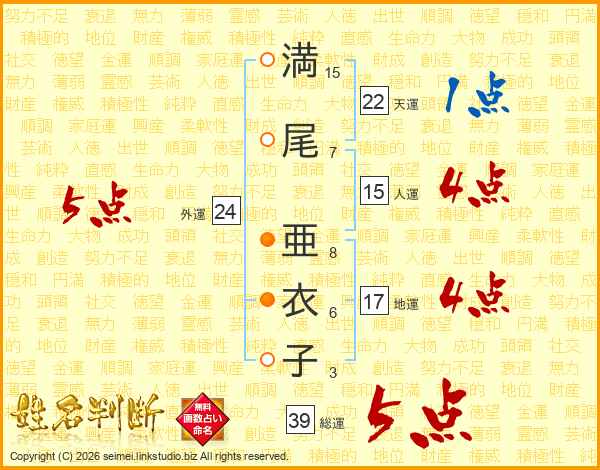 満尾亜衣子さんの総運は39画の5点!