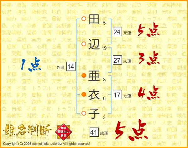 田(5画)辺(19画)  亜(8画)衣(6画)子(3画)