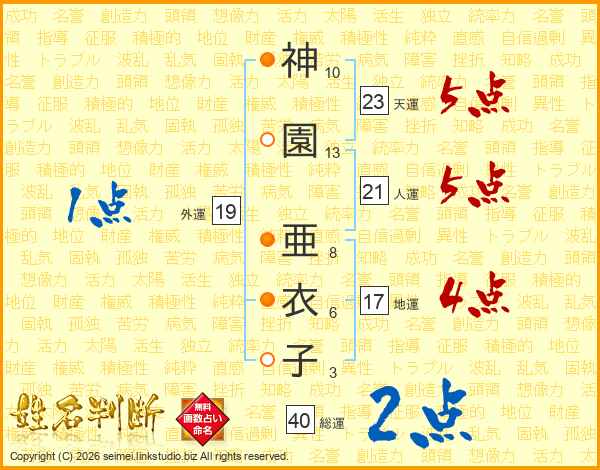 神(10画)園(13画) 亜(8画)衣(6画)子(3画)