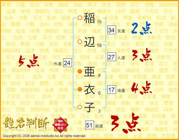 稲(15画)辺(19画) 亜(8画)衣(6画)子(3画)