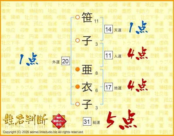 笹(11画)子(3画) 亜(8画)衣(6画)子(3画)