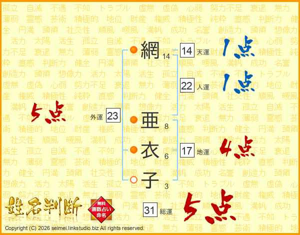生活面を象徴する運勢です。外部から受ける影響力を表し、結婚運、家庭運や職場、環境への順応性を表します。総運から人運を引いた画数。姓や名が1文字の場合を除く。