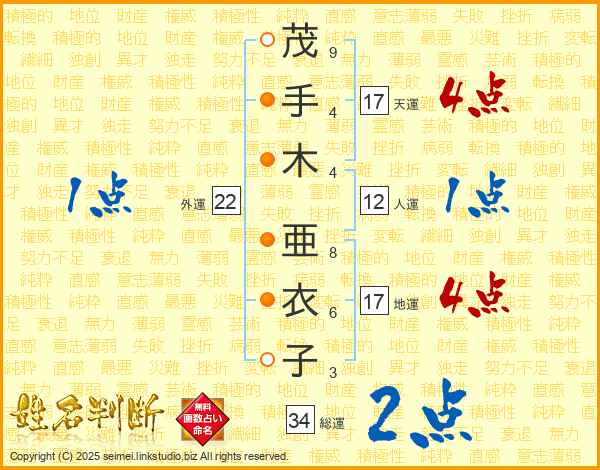 茂(9画)手(4画)木(4画) 亜(8画)衣(6画)子(3画)