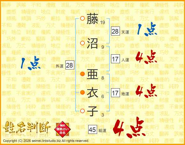 藤(19画)沼(9画) 亜(8画)衣(6画)子(3画)