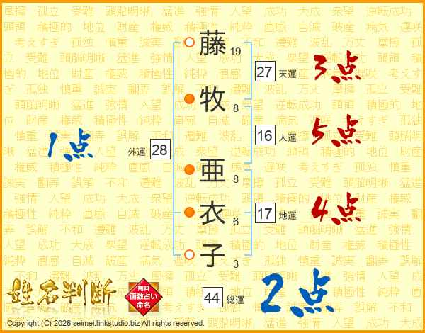 藤(19画)牧(8画) 亜(8画)衣(6画)子(3画)
