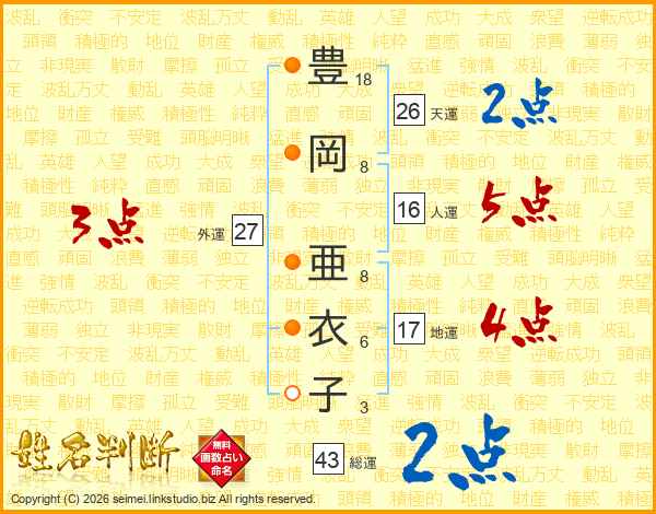 豊岡亜衣子さんの天運は26画の2点!